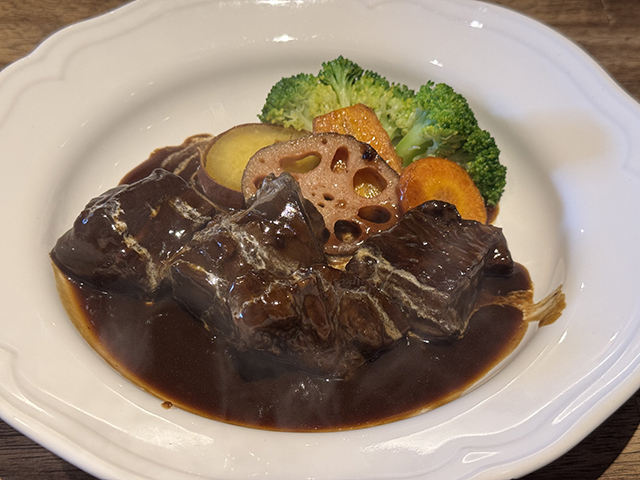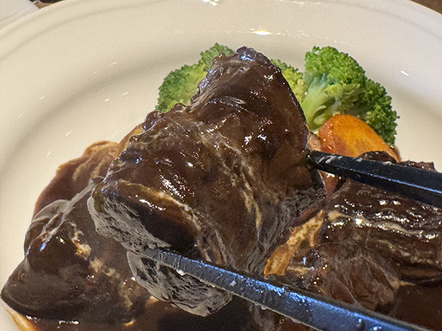 歯がなくてむ切れるぐらい柔らかくて、濃厚なデミグラスソースの旨みとマッチして美味しいですね〜〜