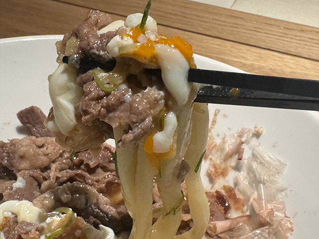 卵の甘みとお肉の旨み、うどんの塩気がマッチして最高の組み合わせですね〜〜