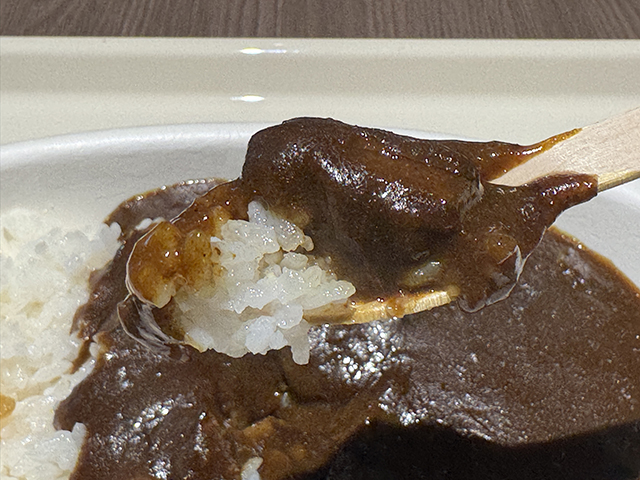 食べた瞬間スパイシーな辛さが口の中いっぱいに広がった後に甘味が後から追いかけてきます。大阪の有名なインディアンカレーみたいな感じです。