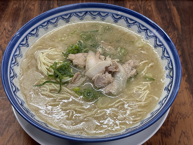 ライト豚骨で細切れチャーシュに青ネギがのっています。