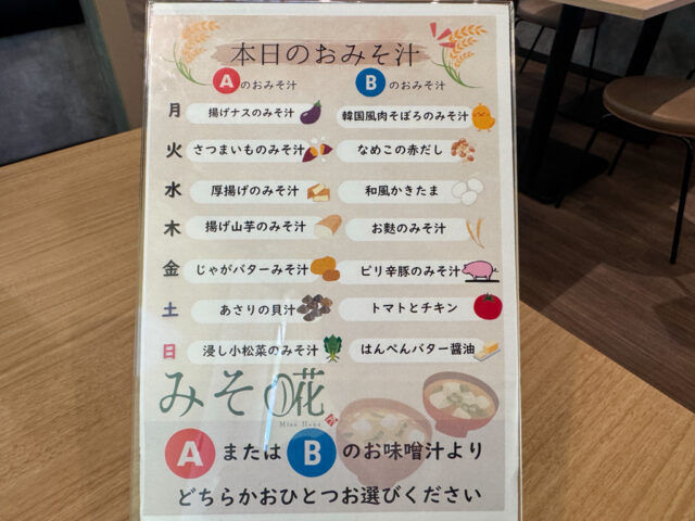 定食メニューでは毎日2種類のお味噌汁があってAかBから選びスタイルです。