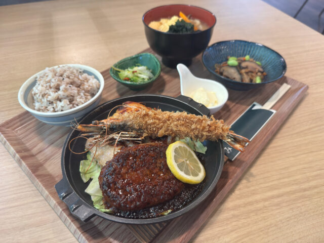 お味噌汁は和風かきたまで、メインは有頭海老にハンバーグに塩糀チキングリルでワクワクしますね〜〜