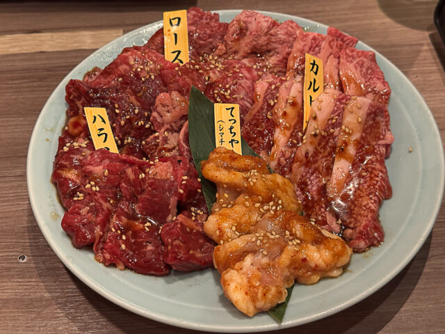 和牛ロース・和牛カルビ・ハラミ・てっちゃんの4種盛りです。