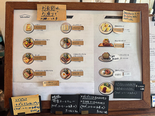 モーニングから美味しい厚焼タマゴサンドが食べれるって聞いたので、早速『タロ コーヒー (talo coffee)』に行ってきました。