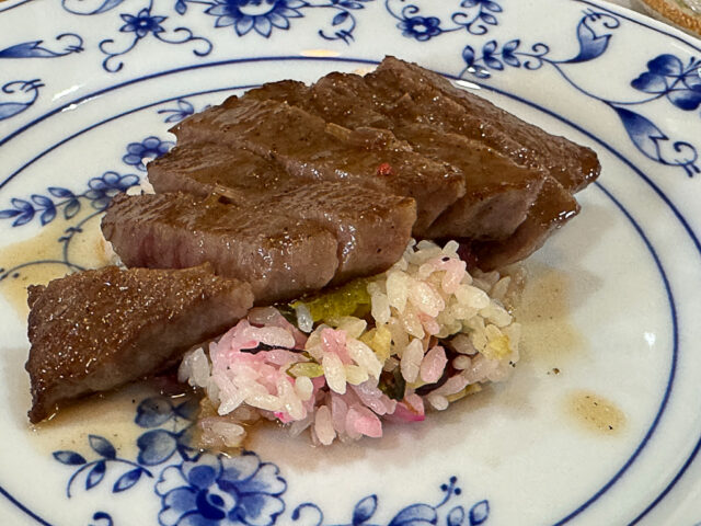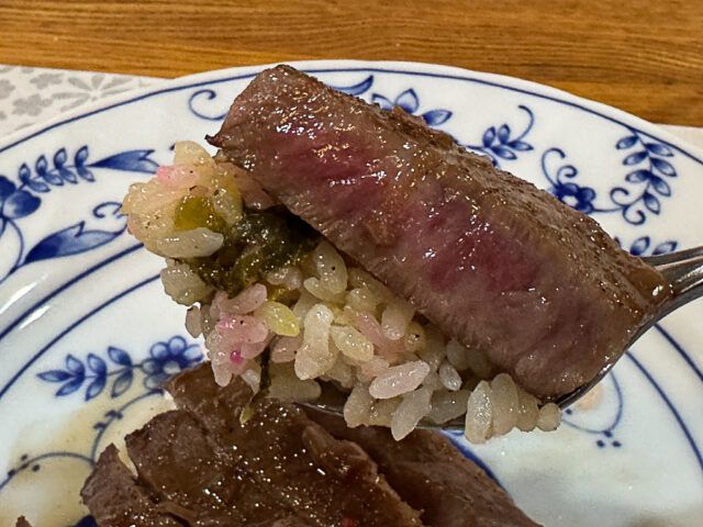 『しば漬けと高菜と梅干しのピラフ ミスジステーキのせ』